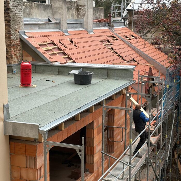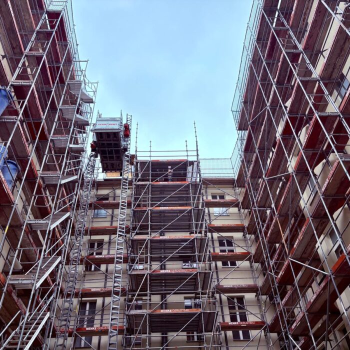 Sanierung eines denkmalgeschützten Mehrfamilienhauses mit Gewerbeeinheiten, Dachgeschossausbau sowie Aufzugsanbau